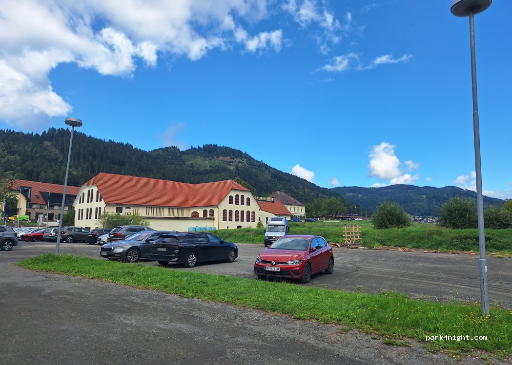 Ebener Schotterparkplatz. Tolles Restaurant mit dem besten Bier in Kärnten! Ruhiger Platz, Straße hört man kaum. Einkehren wird empfohlen. Dann können sie ohne Bedenken hier schlafen.