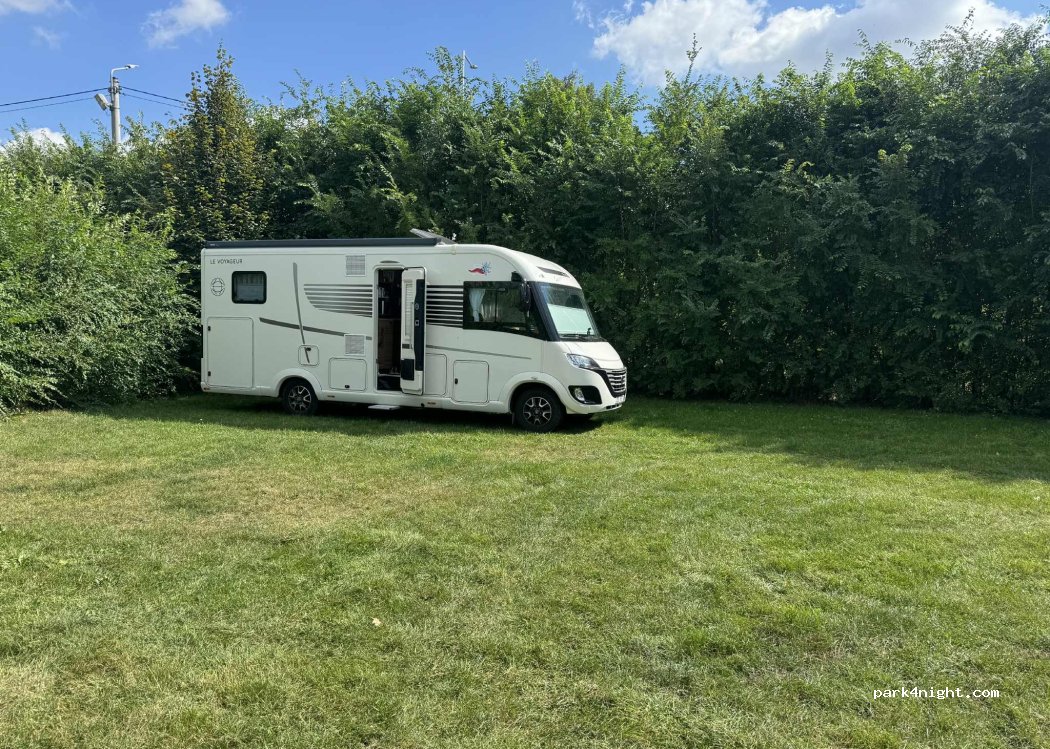 Aire qui pourrait être sympa mais elle est dans un champ et malheureusement on a pas pu y rester car nous avons eut un super orage du coup on c est mit sur le parking du restaurant le patron nous a ditoui car avec orage tout les clients sont partis énormément de monde va et vient toute la journée le week-end ça doit être bruyant on y a dormi q u une nuit