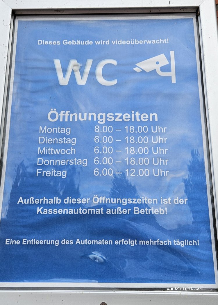 Das WC ist nur Montag bis Freitag von 08:00 bis 18:00 geöffnet. Am Wochenende ist das WC geschlossen. Der Zugang ist nur mit 0,50€ möglich. Siehe Foto.