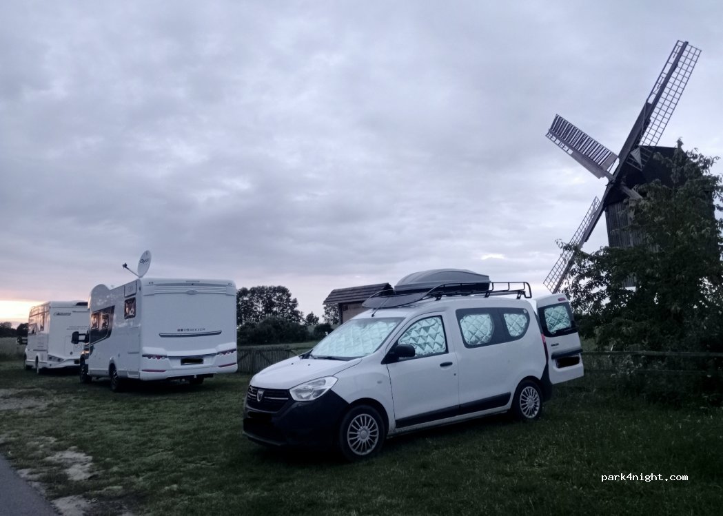 superbe endroit au pied d'un moulin, nous étions seuls au monde face à ce beau moulin. des toilettes sont dispo. au petit matin un homme qui s'occupe du moulin est venu voir si la tempête de la nuit n'avait pas endommagé les ailes et il nous a proposé une visite "privée" du moulin. génial! et nuit au calme bien sûr avec quelques chevaux le matin .