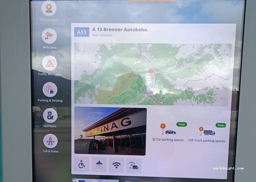 Haben auf der Tour nach Italien dort Halt gemacht. Großer, höhenbegrenzter Parkplatz für Pkw, Vans und Bus <3 m. Sehr hell mit WC, Dusche und Wasserstelle. Nachts ruhig bis auf ein paar kommende oder abfahrende LKWs ( LKW Raststelle daneben). Morgen wird man dann ggf. dich vom Reiseverkehr wach. Fanden die Stelle aber sehr angenehm und ruhig.