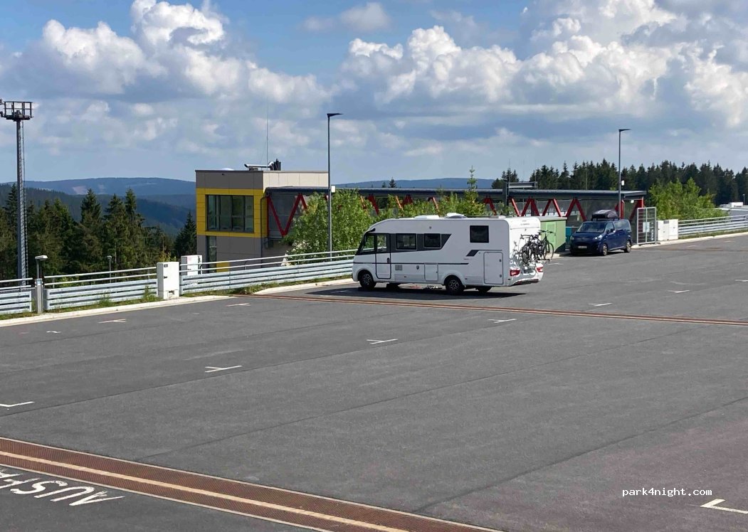 Place de parking au milieu du stade de biathlon avec vue sur le champ de tir (stationnement en hiver pour les camions de cire), douches et WC disponibles. Juste à l'extérieur d'Oberhof.