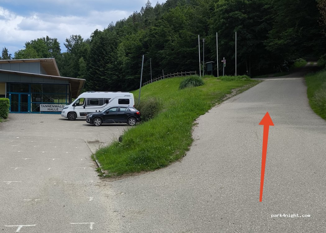 Die Adresse gehört zur Tannenwald Halle, deshalb standen wir zuerst "falsch". Fahrt rechts zum Wanderparkplatz-Waldstadion, dass ist der richtige Name für diesen Parkplatz. Siehe Foto mit dem roten Pfeil... Direkt am Wald mit viele Möglichkeiten zum Wandern, Gassi gehen, Radfahren. Vögel gezwitscher und Natur pur. Kein Strom, Toilette, Entsorgung, Frischwasser Dafür kostenlos und ruhig.