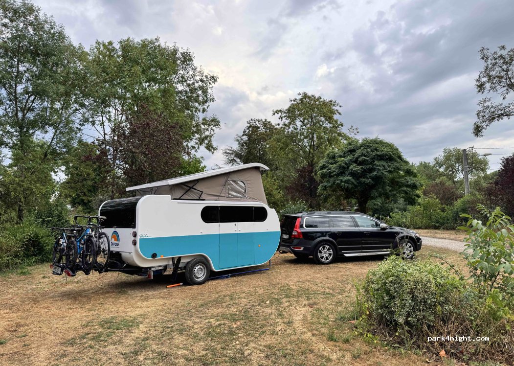 An absolutely beautiful site! The host could not be more open and welcoming. The site has good sized pitches, electricity, water. Black and grey disposal areas and WiFi etc. village a 5 to 10 minute walk. Right next to a beautiful river. 2 adults and 1 insane dog. Here for 2 nights. €26 per night inclusive. Absolutely worth the money. Will definitely be back.
