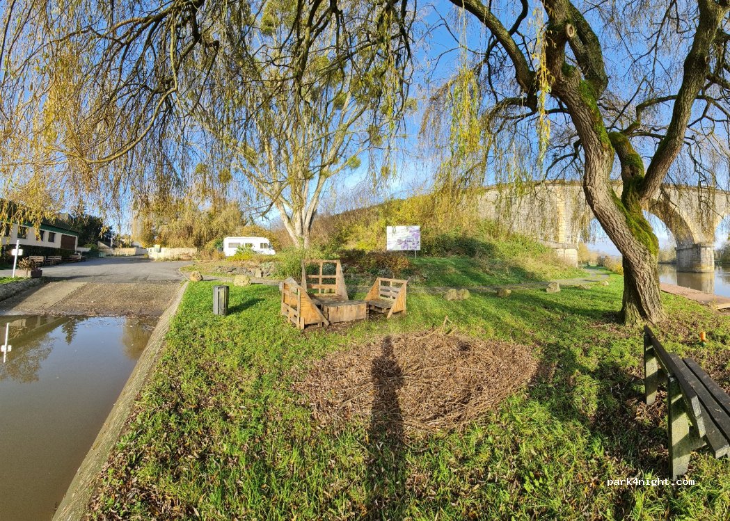 Bon spot, bord de rivière près du port et du pont SNCF. ce n'est pas le bruit des rails qui est gênant, mais les vacanciers des bateaux amarrés bruyants et sans gêne. 2 belles places en pente mais avec les cales position haute on arrive à un niveau plat. Avons fait le plein d'eau et vidangé les eaux grises, pas trouvé pour les eaux noires. Nous restons pour la nuit quand-même. Merci à la mairie.