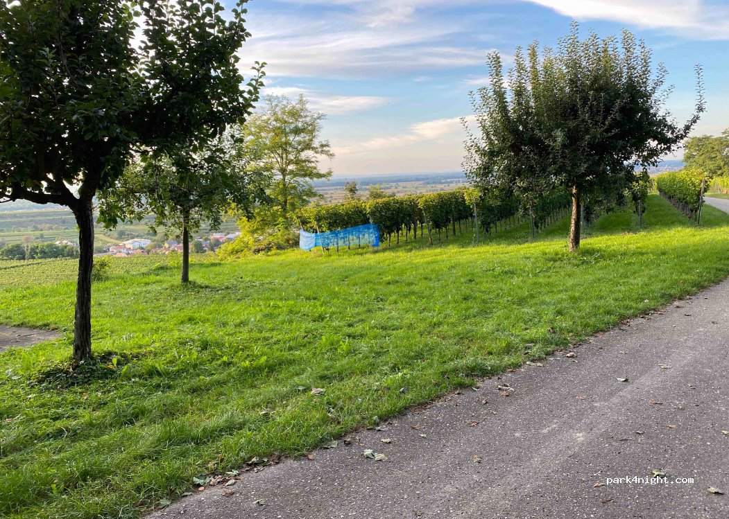 Picknickplatz mit Holzbank und Tisch. Schöne Aussicht über den Rhein in die Vogesen. Zufahrt teilweise steil und enge Kurven. Kaum eben Flächen, dafür Obstbäume und Weinreben. Kein Mülleimer. LTE (Telekom) zwei Balken. Waren abends hier und sind dann weiter.