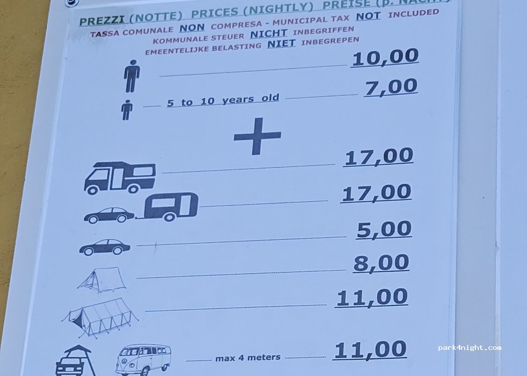 Bien pour passer une nuit et nous dépanner en arrivant en Italie sans plus. 34€ une nuit en van 2 adultes/2enfants. Sanitaires propres