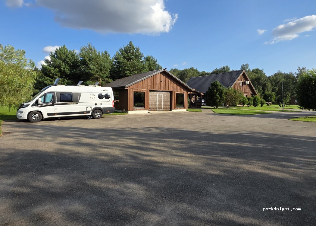 Very tidy spot. Gravel carpark set back from the road. Nice shower and toilet, although shower screen was off its runner. Road a bit noisy. Restaurant not bad, does Lithuanian dishes, good value. Easy cycle to hill of crosses. Had deer by van in evening.