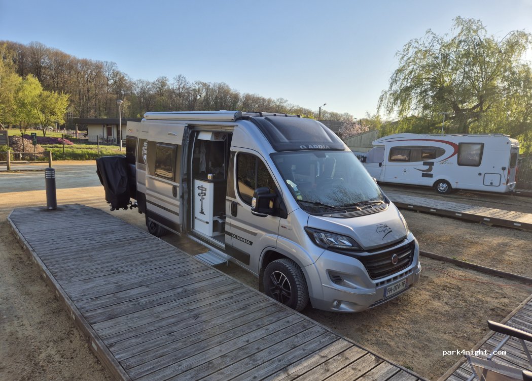 Babar s'est arrêté ici, belle aire avec tous les services, pour /- 8€ sauf que lors de notre passage la borne ne fonctionnait pas, avons prévenu la mairie qui va faire le nécessaire. Possibilité de stationner malgré tout. Proche centre ville avec boulangerie, supérette, petit marché le samedi matin et la forêt pour de belles ballades