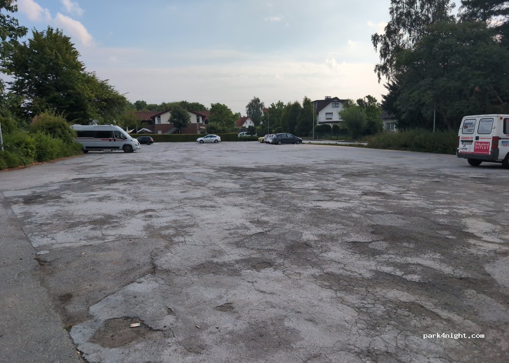 Ein asphaltierter, eigentlich recht ebener Platz in einer ruhigen Wohngegend. Tagsüber ab ca 7Uhr geschäftig, aber in der Nacht sehr ruhig. Für eine Nacht auf Durchreise zweckmäßig und zu empfehlen.