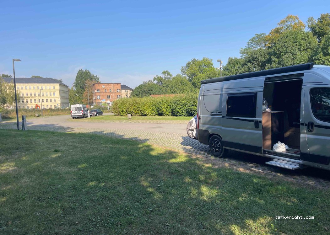 Altenburg motorhome site, paved pitches parallel to the access road, by the lake. 10-15 minute walk to the town center. Quiet location. Toilets and showers on site (€0.50), heated in colder weather.