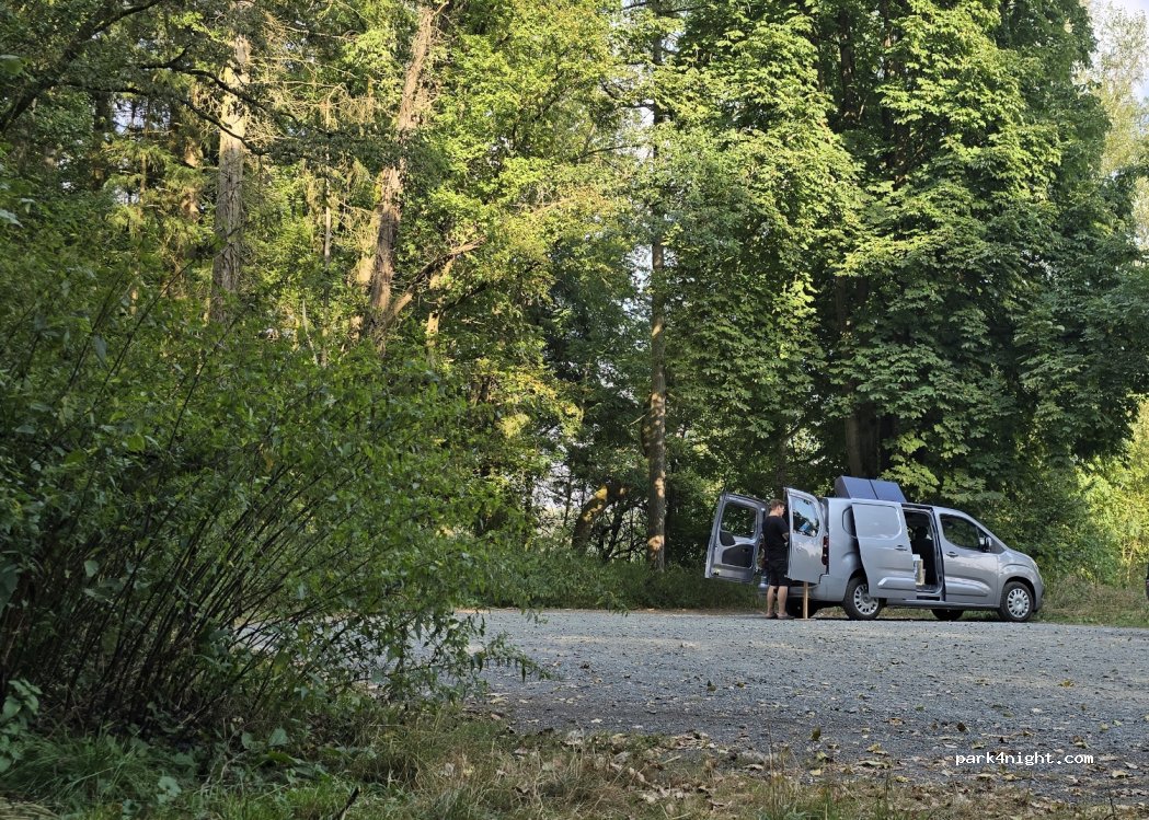Schöner Parkplatz direkt am Wald. Es gibt eine Bank mit schöner Aussicht. Die anderen Bewertungen sind nicht nachvollziehbar. Nachts hört man die Straße nicht. Wir waren die einzigen Besucher. Spaziergänger kommen vorbei, aber das dürfen die auch. Keine Toiletten vorhanden aber Mülleimer. Wir hatten eine schöne Nacht.