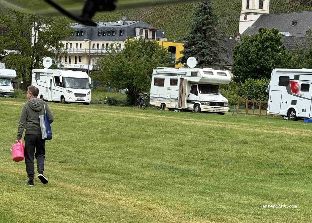 Sehr schöner Platz auf der Wiese direkt an der Mosel. Wenn es regnet muss man allerdings aufpassen das man sich nicht fest fährt. Allerdings haben wir auch beobachtet, dass ein Traktor sofort vor Ort ist und hilft. Kosten 10 Euro / Tag oder 14 Euro inkl. Strom. Ver- und Entsorgung vorhanden. Sehr schöne Aussicht, ringsum Weinberge. Uns hat es sehr gut gefallen wir kommen aufjedenfall wieder.