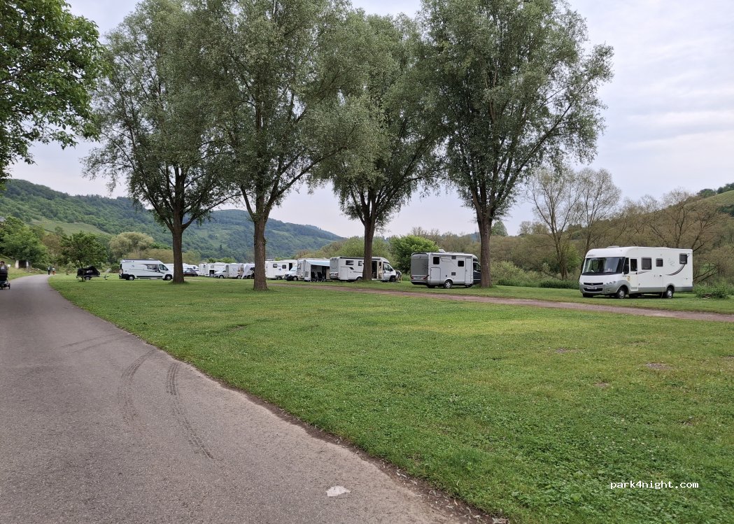 Parking on grass along the Mosel, direct access no cycle park between you & the river! Gentleman came early evening to collect fee, 8€ / night + electric if you want it. Free WiFi. Service point for black/grey waste, water 10c or 1€. Quiet location