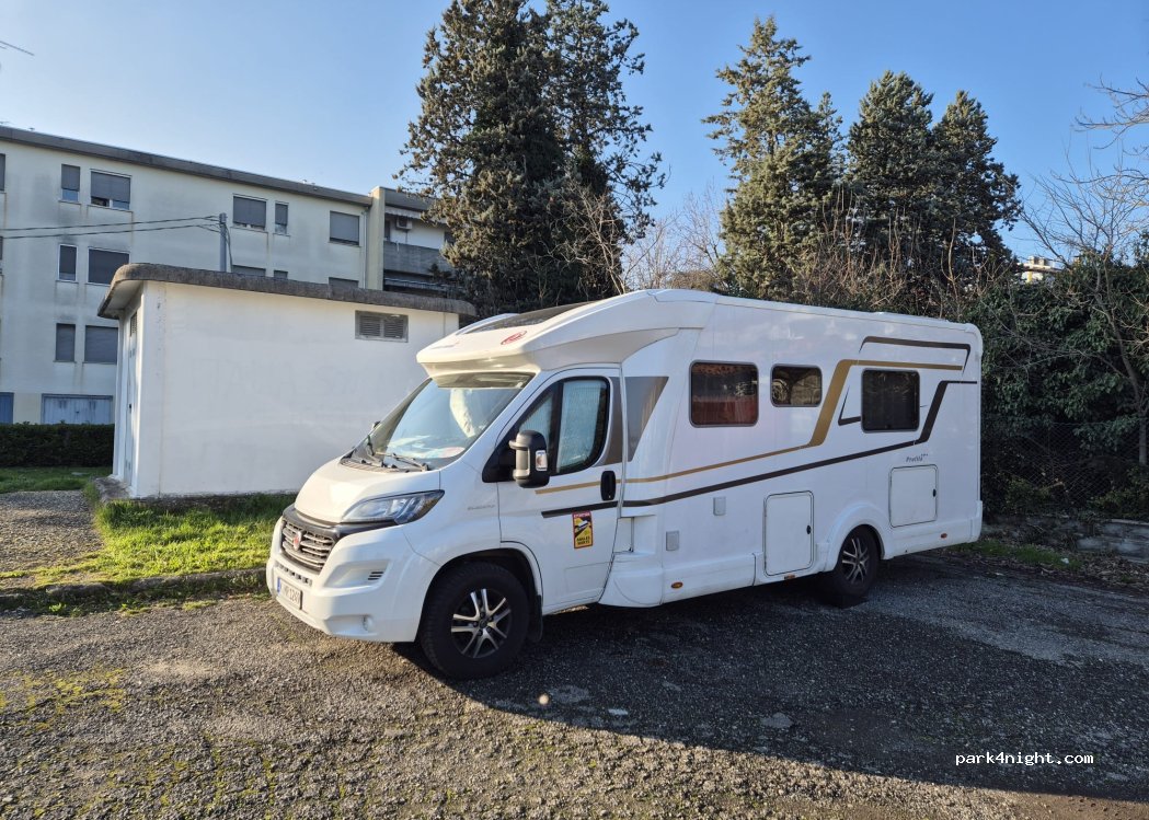 Passata qui una notte molto tranquilla, a 50 metri da qui, in via Salvo D'Acquisto, c'è un piccolo parcheggio dove sostare più interno rispetto alla strada principale. Notte tranquilla, zona residenziale, sicura. Leggermente in pendenza in alcuni punti.