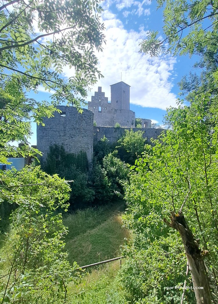 genug Platz um sich für eine Nacht mit dem WoMo hinzustellen. Direkt erste Reihe mit Blick auf die Burgmauer max. 3 Plätze, kostenlos,sauber,ruhig. Nah an der A7. Der Weg zur Burg ist schmal - 2 WoMo‘s passen nicht nebeneinander- also besser langsam fahren.