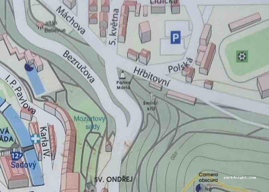 A quiet, spacious, free parking area. Fairly level. No facilities available. Temporary restrictions may apply (e.g. during the long May weekend when the spa season officially starts in K. Vary). The spa town center is within walking distance, but keep in mind the elevation difference — the return walk to the parking lot is quite uphill and may be a bit tiring.