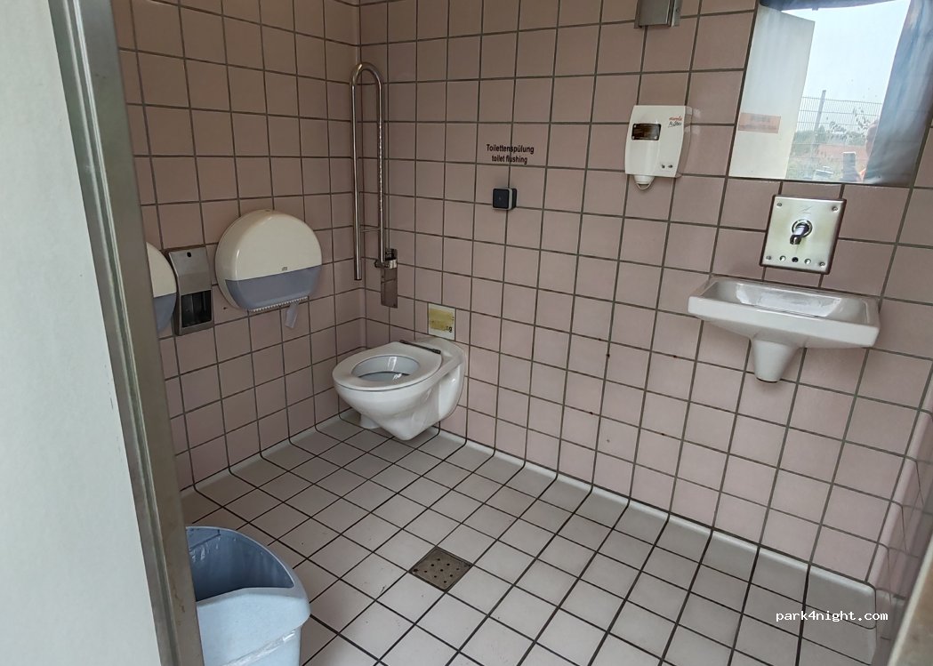 Parken nur während der Entsorgung, keine Übernachtung möglich, Entsorgung von Grauwasser. Frischwasser oder Strom für 1 Euro. WC ist sauber.