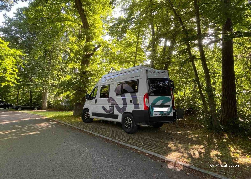 Free parking at Park Feldafing. Beautiful walks through the park overlooking the lake and golf course. Beach with swimming only about 200 meters away. No prohibition signs, overnight stay is possible. Not too noisy and very dark late at night. Very little Solar due to trees, Starlink works though. Only flat spots are near the top end of the parking. Views across the lake are not to be missed!