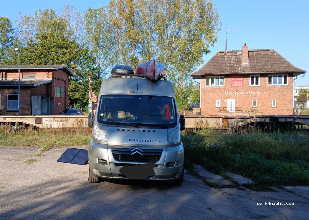 Des Abends recht ruhig, Platz reichlich vorhanden; etwas Gesträuch, an welches man sich als Präsentiertellerverächter weltabgewandt schmiegen kann, gibts auch. Bahngleisflair. Ein Triebwagen fährt langsam heran; ein Bahnarbeiter kommt, stellt eine Weiche um, winkt ihn durch. Den Van beachtet er nicht weiter. Fahrende Hotels passen hier wohl weniger hin. Aber die mögen es hier bestimmt auch nicht.