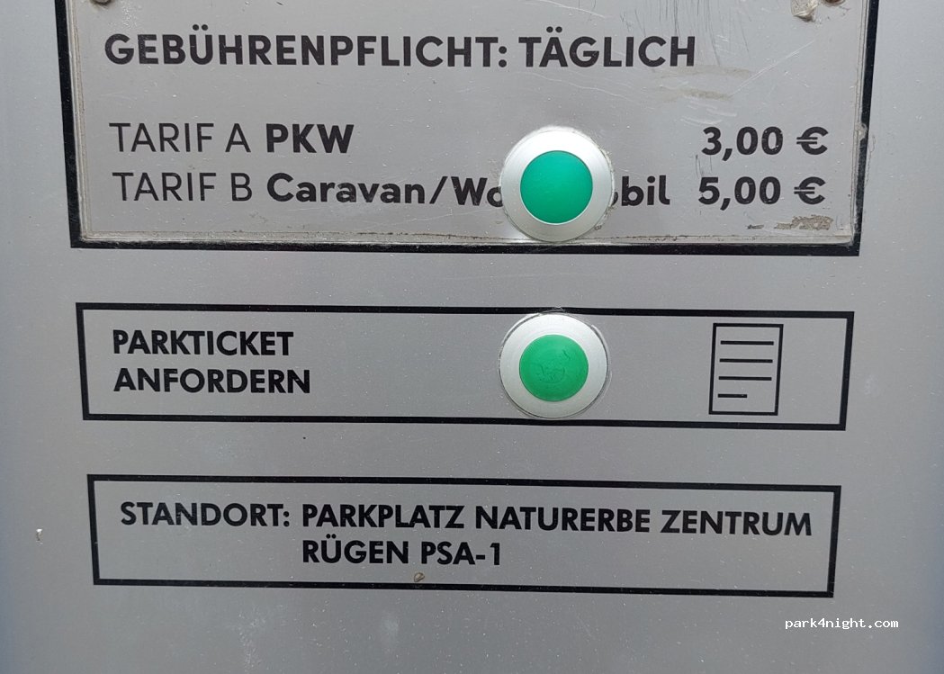 Für 2,00€ sehr fair . Nachts sehr ruhig. Reserve- Parkplatz für empfehlenswerten Baumwipfelpfad, Galileo Center , Oldtimer Museum, Prora mit Strand und Einkaufszentrum im Bau. Alles gut zu erlaufen oder radeln.