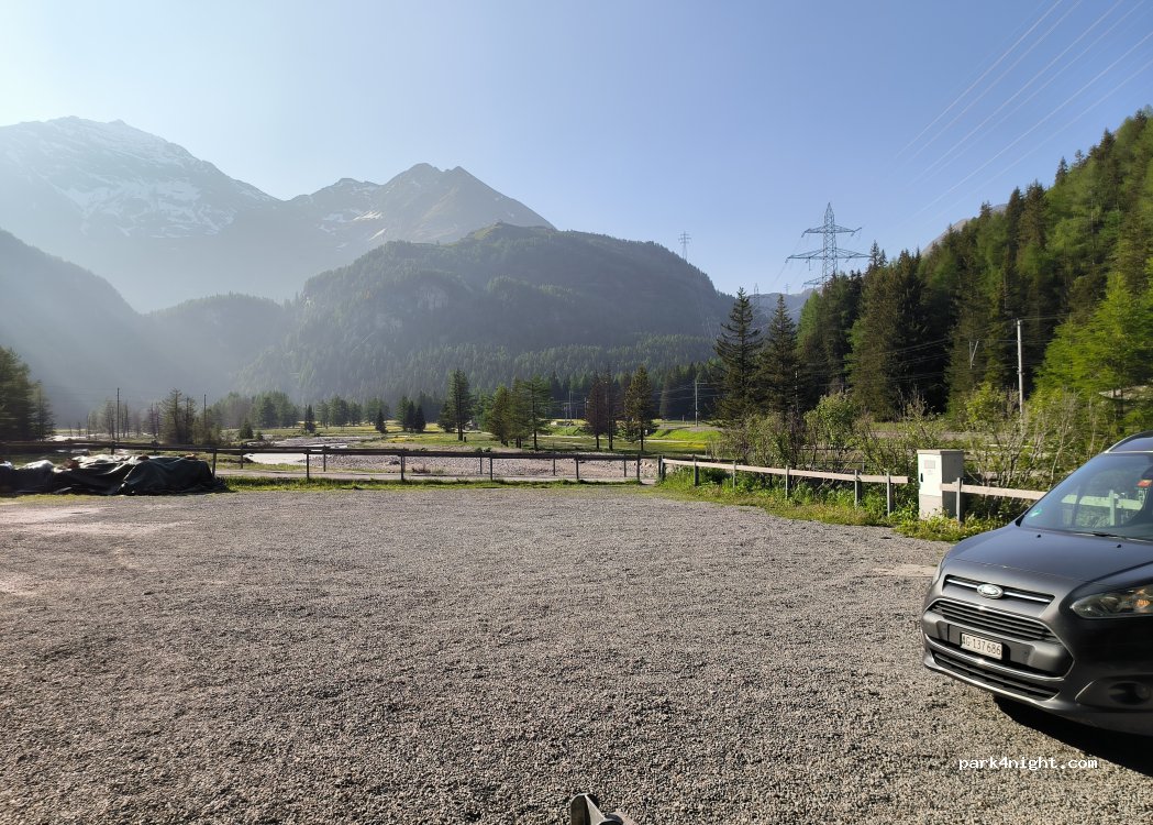 Parking at the Cavaglia Glacier Garden. Both the car park and the visit to the glacier garden are free of charge. Toilets are open during the day. Straight and level place. Railway tracks are nearby