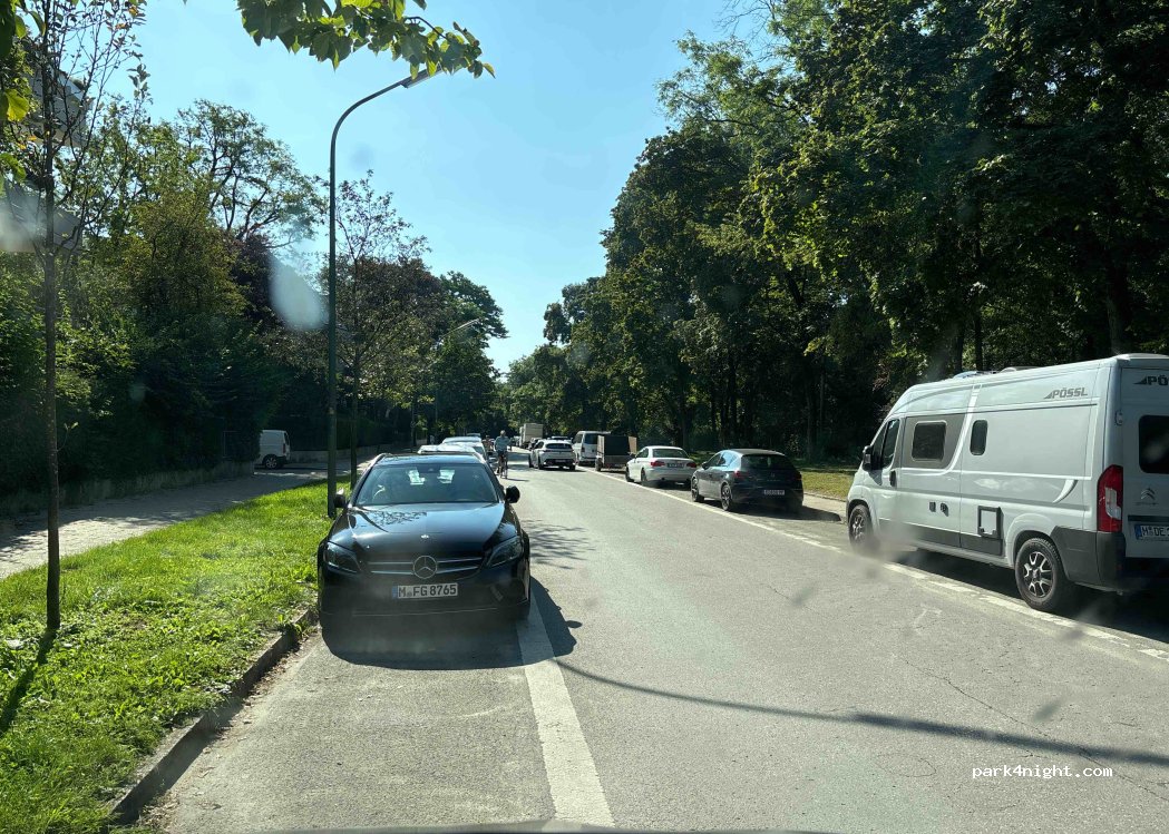 Excellent road for free parking. Just outside of the Lez zone. Right next to the English gardens which are lovely. Long walk to town or U bahn. If you park close to the corner, it's a 30sec walk to a stream to paddle and wash in too. Road is quiet at night but traffic starts at 7am ish.
