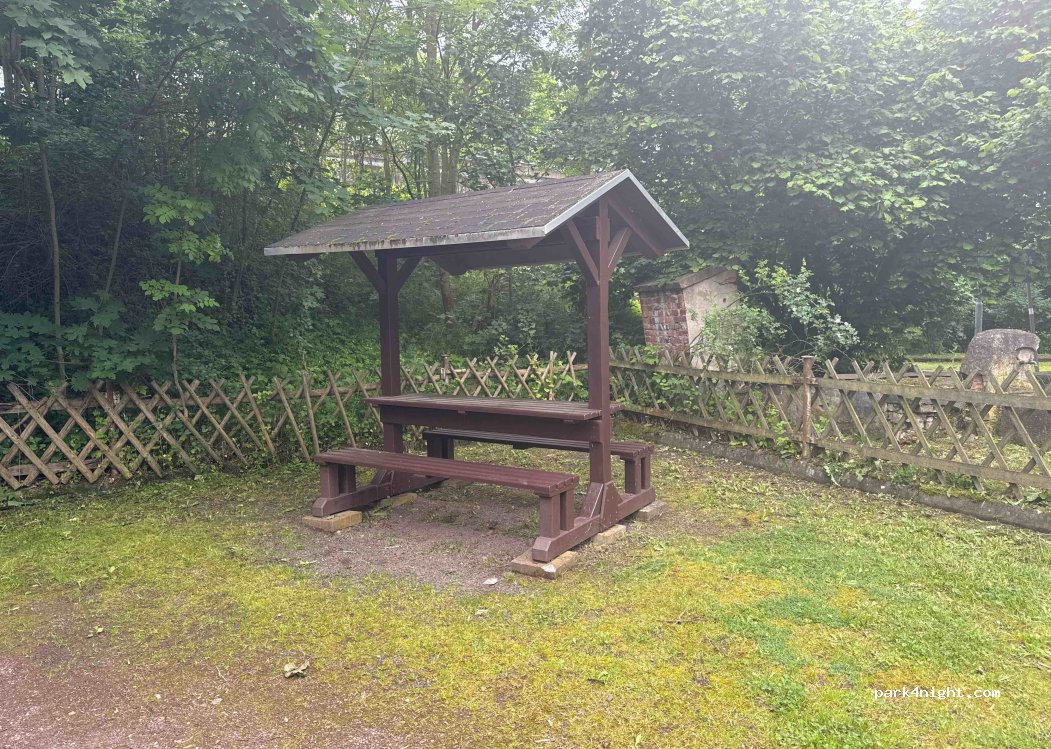Grand carré avec banc de pique-nique. Rivière, prairies, idéal avec les chiens. Résident sceptique. Nature. Le train est bruyant. Sinon calme.