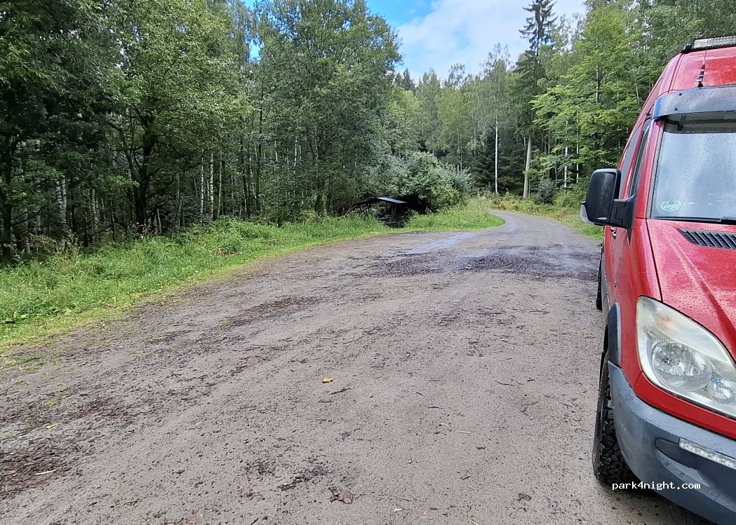 Covered picnic area. Level stand for a smaller vehicle. The adjacent road is not very busy. At night it is very quiet. Unfavourable when it rains, as the ground is not paved.