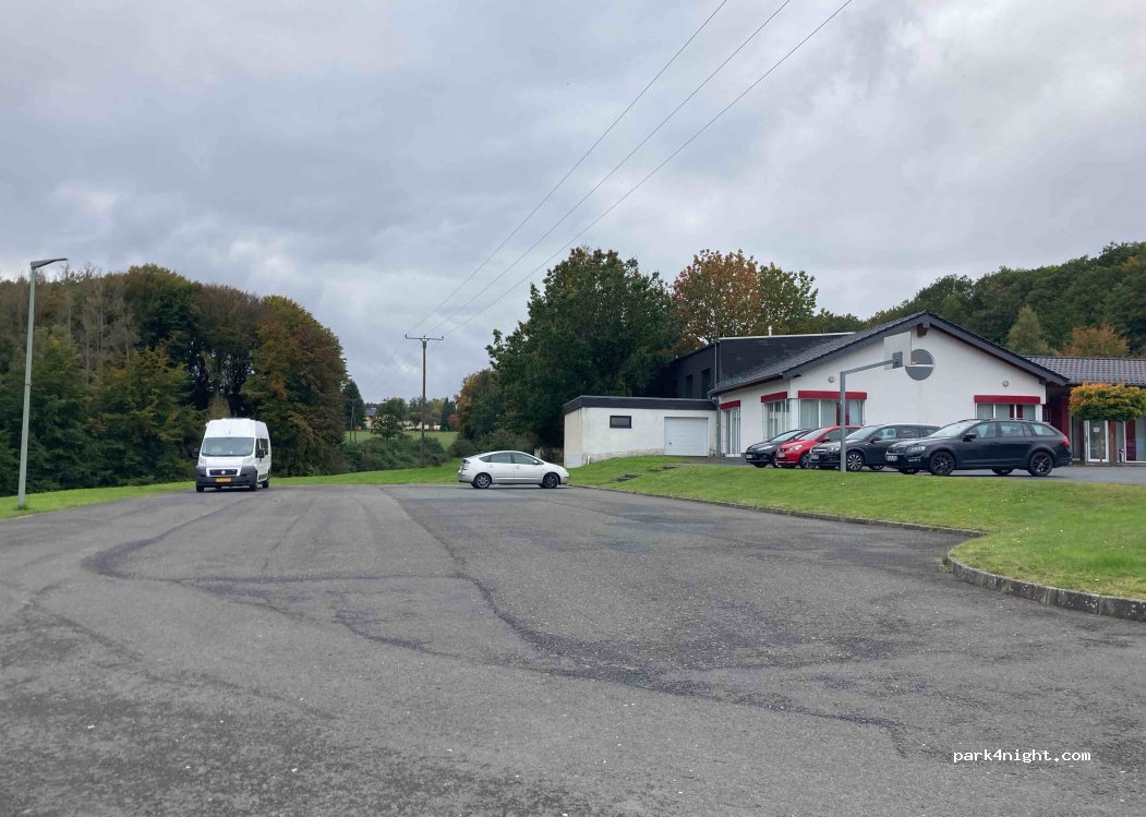 Parkeerplaats van een kleuterschool aan de rand van een bos. Rustig en stil om te slapen. In de ochtend kunnen er wel wat mensen toekomen op de parking die hun kinderen komen afzetten aan de school, maar zelfs dan was er geen drukte. In Horhausen, een paar minuten rijden van deze plek, zijn er restaurants etc. We raden zeker pizzeria La Volpe aan.