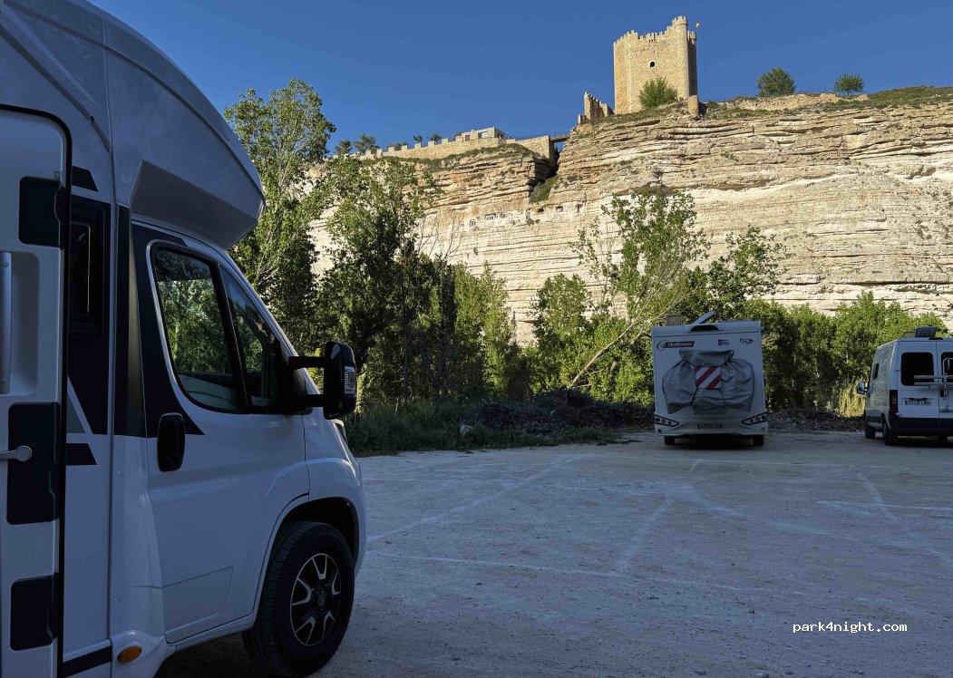 Superbe emplacement ! Pratiquement seul en contrebas du château. Nuit extrêmement calme avec le réveil des oiseaux. La remontée de la partie basse du parking peut-être problématique pour les Camping-cars lourds ou en cas de pluie. Le village est a 8 minutes à pied en longeant la rivière. Alcala del Jucar est vraiment une belle surprise qui mérite le détour!