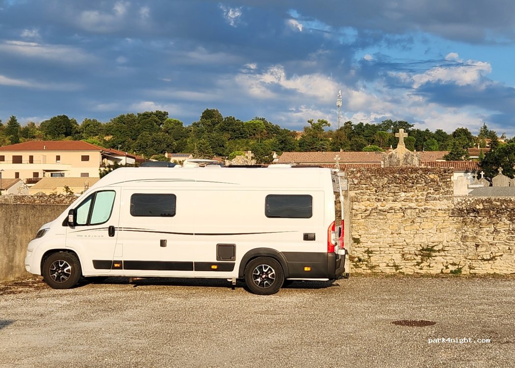 Dieser Stellplatz verfügt über Alles was man benötigt. Müllcontainer und Wasserhahn auf dem Friedhof,ein sauberer,friedlicher und ruhiger Ort in der Nacht. Die anliegenden Straßen sind nicht zu hören,man hört nur den Hahn am Morgen.Wir würden wiederkommen. Empfehlung,fahren Sie um den Friedhof herum,dort ist es ruhiger. Danke für diesen Ort.
