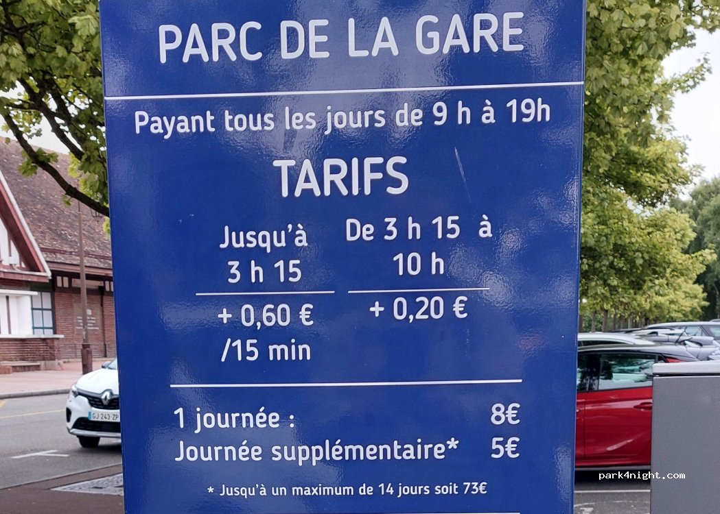 parking idéal pour visiter la ville. Prix raisonnable, regardez les photos de P4N pour le tarif. Aujourd'hui, peu de CC, donc, on peut avoir une place pour se garer. Il y a un très grand CC type bus, et d autres entre 7 m et 7,5 m qui sont garés. Il faut bien suivre direction parking de la gare pour y arriver.
