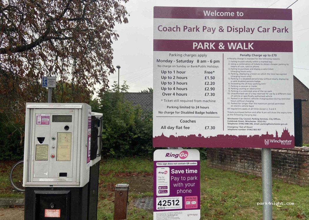 Well located for Winchester centre, slightly sloping but not a problem for us, quiet over night, free 6pm - 8am, cash payment at machine for daytime or use Ringo (cash may be easiest if you want to stay in coach area depending on what vehicle type your motorhome is in app). Toilets open during daytime