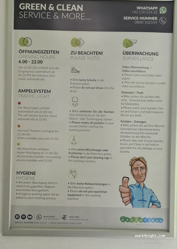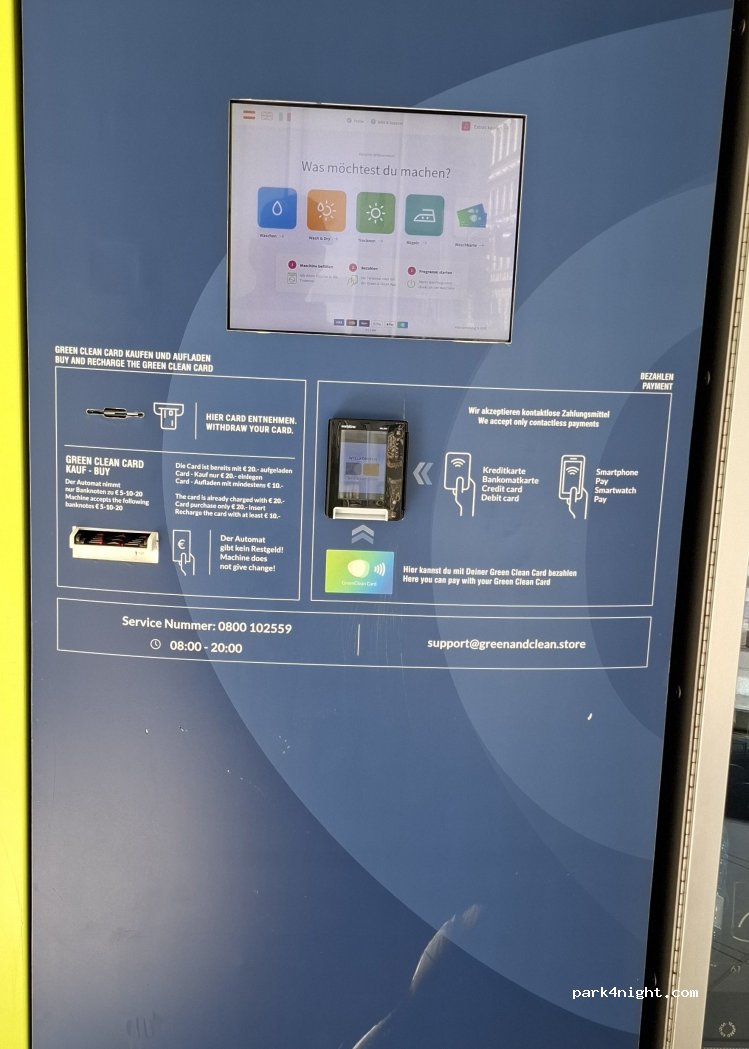 Green & Clean self service laundrette with 20kg & 8 kg washers 30kg & 15kg dryers. Contactless card payments available, doesn’t take cash. Gives you the option of buying a ‘Green Clean Card’ but I’m not sure this is worthwhile. Has a snack/drinks vending machine, benches & seating. Instructions in English too.