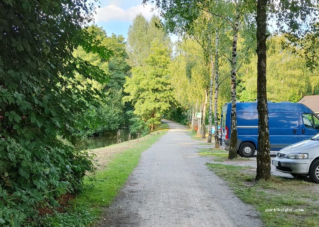 Quiet place just 5 minutes from the highway, so a good place for staying the night for on the road. There are signs pointing in the direction of this parking space designating it specifically for campervans. There were 2 other vans, so we felt quite safe. In the morning there were joggers and people walking their dogs, but still quiet.