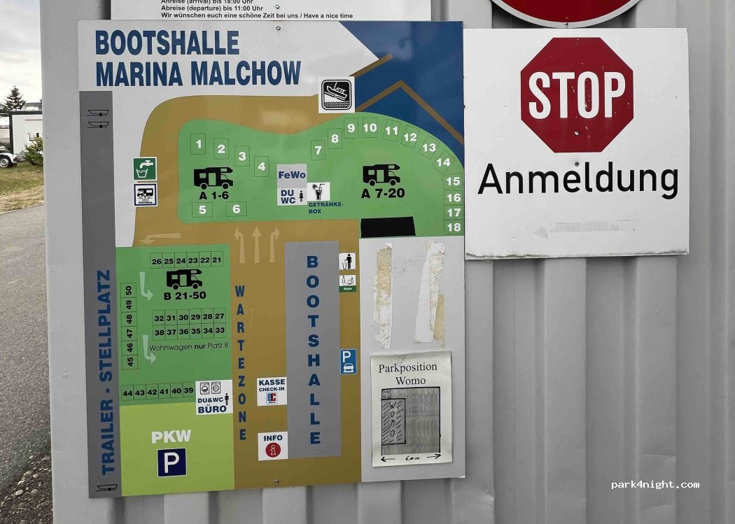 Ich kann mich den vorherigen Schreibern nur anschließen. Der Stellplatz an der Bootshalle ist super gelegen, reist man zeitig an, besteht die Möglichkeit am Wasser einen Platz zu bekommen, ansonsten findet sich meist ein großzügiger Platz auf der Wiese hinter dem Bürocontainer. Die beiden Betreiber sind sehr freundlich und hilfsbereit, schon bei der Einfahrt gibt’s einen Zettel mit allen Wissenswertes über den Platz-Super gelöst. Herren-WC und Duschen sind im Container hinter dem Bürocontainer, die Damen haben es in einem festen Gebäude etwas komfortabler, aber es ist alles sauber und ordentlich. V+E-Station mit Ausguss für Grauwasser und Chemie-WC und Trinkwasser vorhanden, in einem kleinen Holzbau beim Damen-WC gibt’s einen Kühlschrank mit preisgünstigen alkoholischen und alkoholfreie Getränke, so wie einige Bücher. Hier bestellt man auch Brötchen, die im Bistro an der Bootshalle abgeholt werden. Einziger kleiner Kritikpunkt ist, dass die Stromsäulen an den Wasserseitigen Plätzen etwas weit auseinander liegen, langes Kabel sollte man dabei haben. Die Inselstadt Malchow erreicht man über einen Waldweg am See entlang fußläufig in einer knappen halben Stunde.