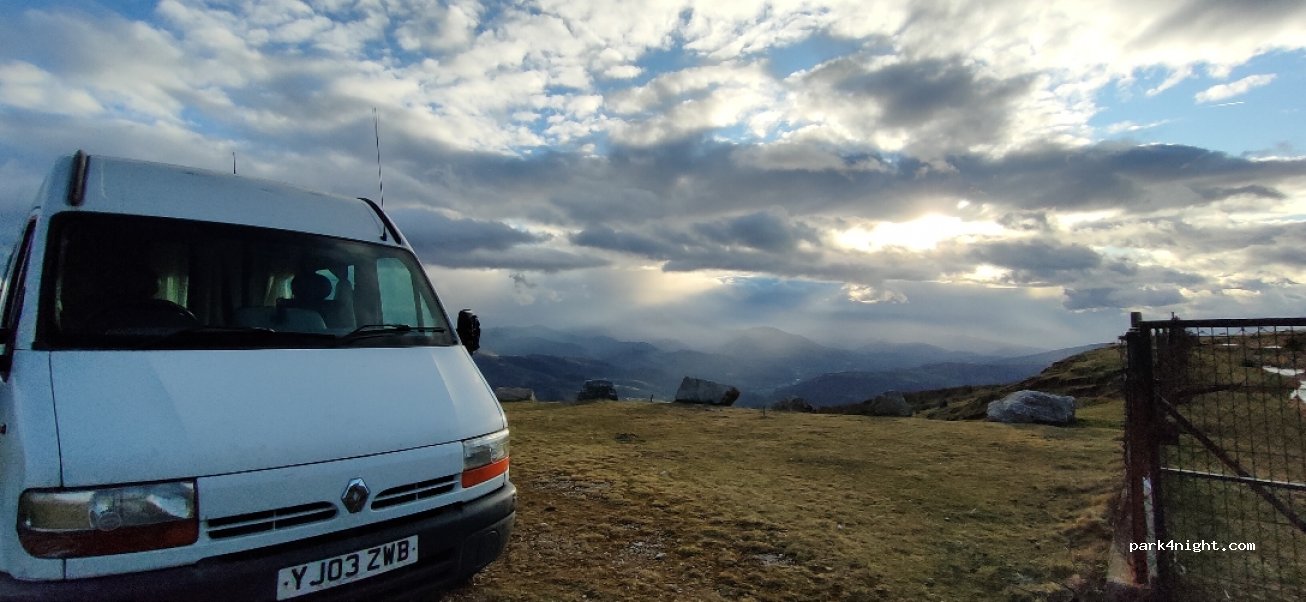 Sitio espectacular. A escasos 20m de llegar a la cima había un charco grande en medio del camino difícil de sortear. Pero si das media vuelta para deshacer el camino encontraras, a unos 20-30m aprox, un camino de hierba sin rodaduras a mano izquierda para acceder al spot como ruta alternativa. Transitable para furgo grande. Ojo, MUCHOS animales muertos y mucho viento. Buena cobertura 4G.