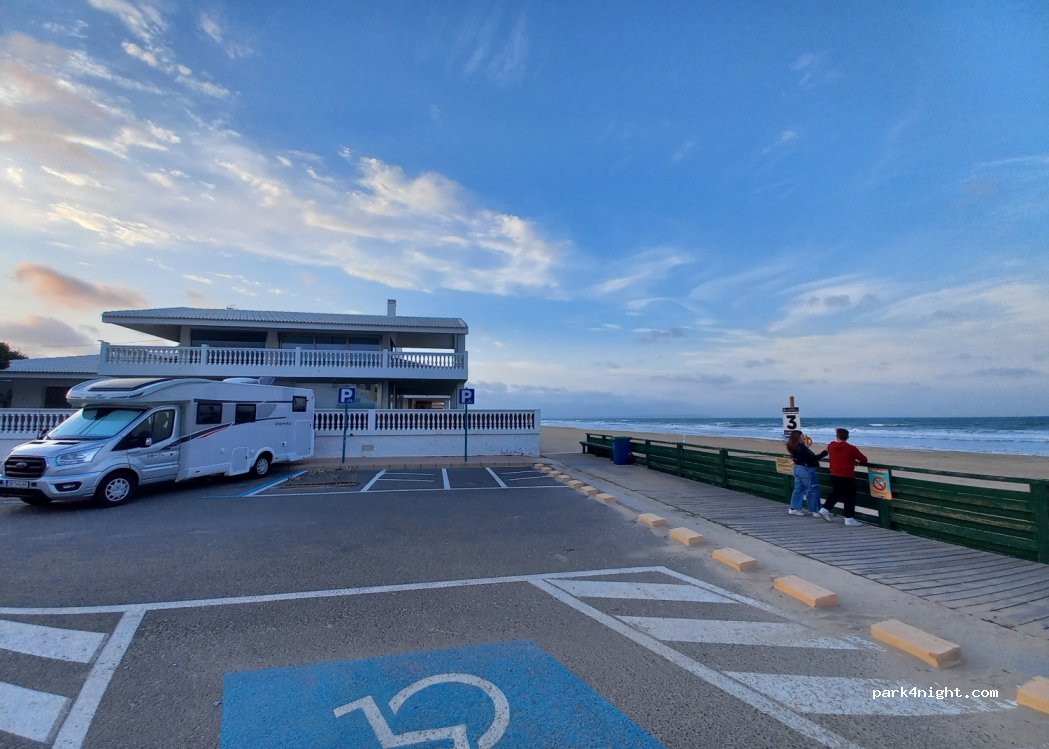 Hemos pasado varias noches en este parking en Semana Santa y muy bien. Es zona azul pero funciona solo en verano. Estás literalmente al lado de la playa, hay agua para limpiar los pues. Algo de movimiento por la mañana si el día es de playa, pero por la noche muy tranquilo, se descansa bien. Carrefour, bares y restaurantes a 5 min andando. Centro del pueblo a unos 20 min. Abstenerse ACs > 7m