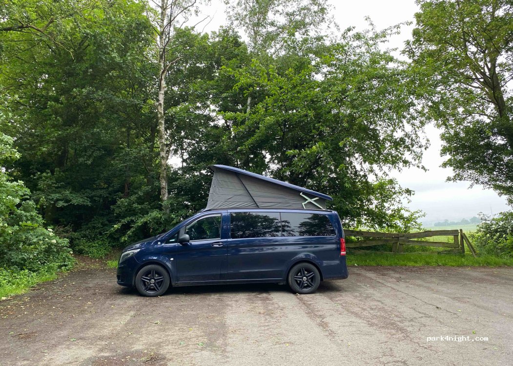 Small parking area under ruined castle. Sloping. Only for small vans.