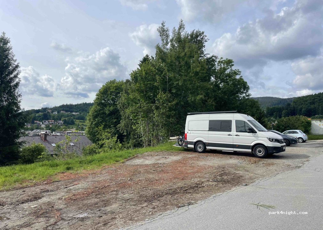 Parkplatz am Sonnenhang von Bodenmais, immer Platz für ein oder zwei Kastenwagen. Anfahrt führt über eine einspurige Brücke, aber ideal für Kastenwagen mit Ausblick auf Bodenmais.
