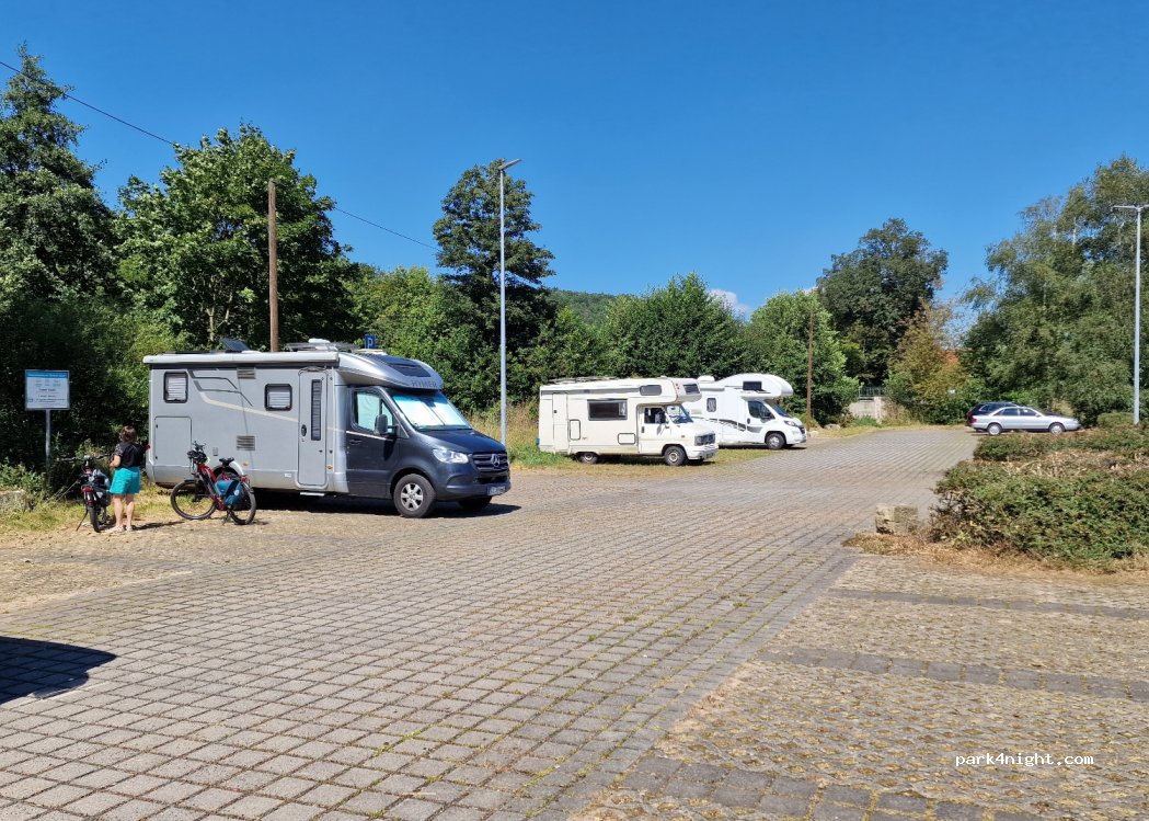Offiziell gibt es 5 Stellplätze für Wohnmobile, tatsächlich waren es heute 10, die geduldet werden, zumal der PKW-Parkplatz davor sehr groß ist und nie ganz genutzt wird. Stellplatz ganz nah an der Werra. Man hört das Rauschen des Wasserfalles bzw. des Wehres... zu Fuß in 10 Minuten in der Altstadt, die mich total überrascht hat, da sie sehr schön ist.