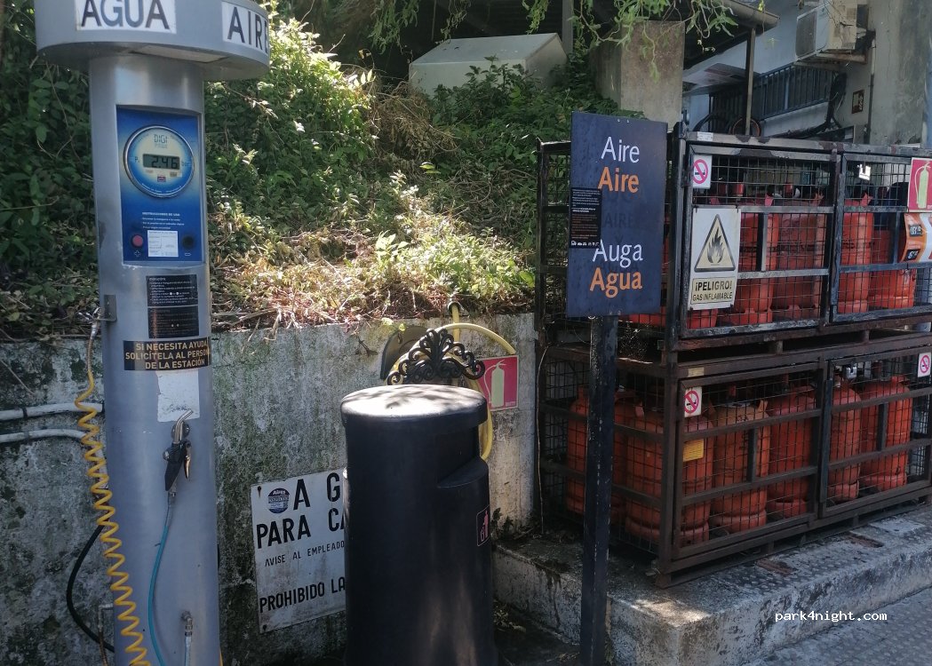 Station service repsol avec shop et café. Toilettes propres. Borne de gonflage sur l'aire de vidange. Ouvrir la plaque en fonte au sol et manoeuvrer pour se placer bien au dessus pour eau grise. Pas très pratique mais fonctionnelle.