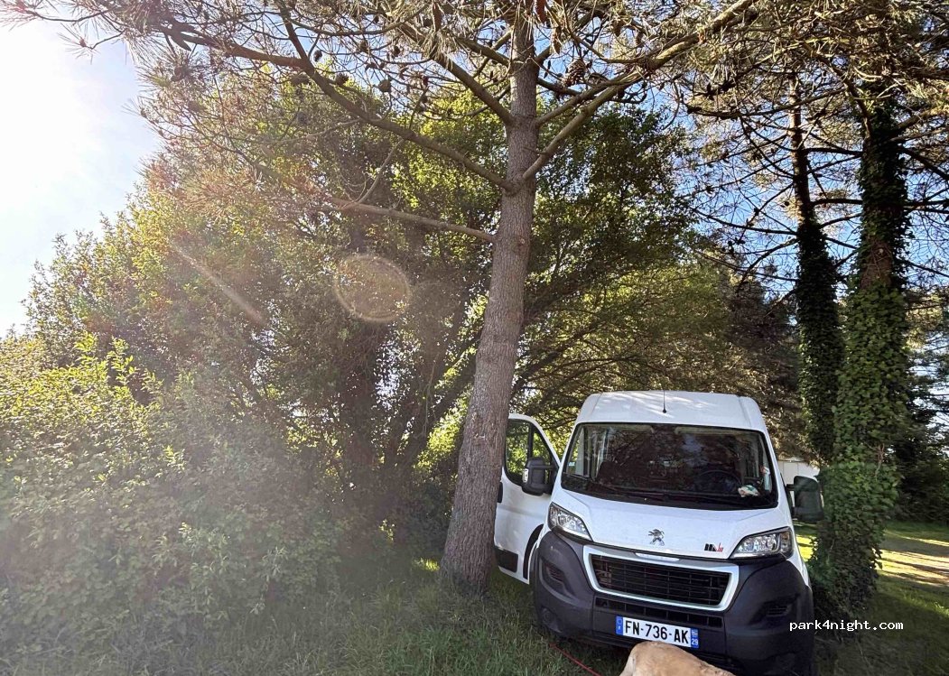 Nous sommes stationnés avec d.autres ccars sur l.herbe en bordure de la mini rte qui mène au centre nautique et à la plage à l.ombre nuit très calme, de nb ccars sont stationnés sur le parking mais promiscuité ! et soleil Clyvan