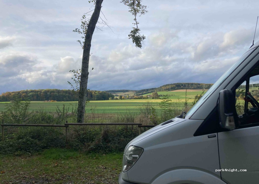 Das Wäldchen auf einer Seite des Parkplatzes wurde abgeholzt. Man steht deshalb etwas offener, aber geniesst dafür die Aussicht über die Felder. Ruhige Nacht hier verbracht, morgens haben Waldarbeiter den Parkplatz genutzt.