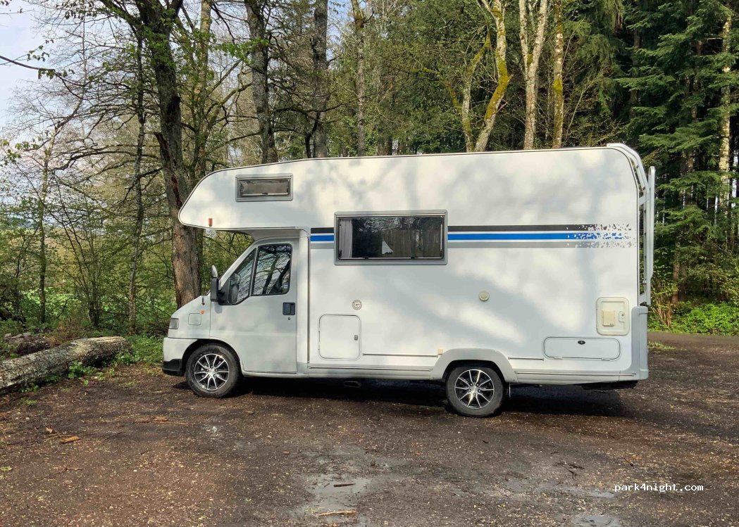Waldparkplatz. Ruhig gelegen nur das Autorauschen in der Ferne zu hören, keine Verbotsschilder. Gerader untergrund. In der Nähe, bergauf eine Burgruine. Schöne Aussicht. Kein Strom, Wasser oder ähnliches.