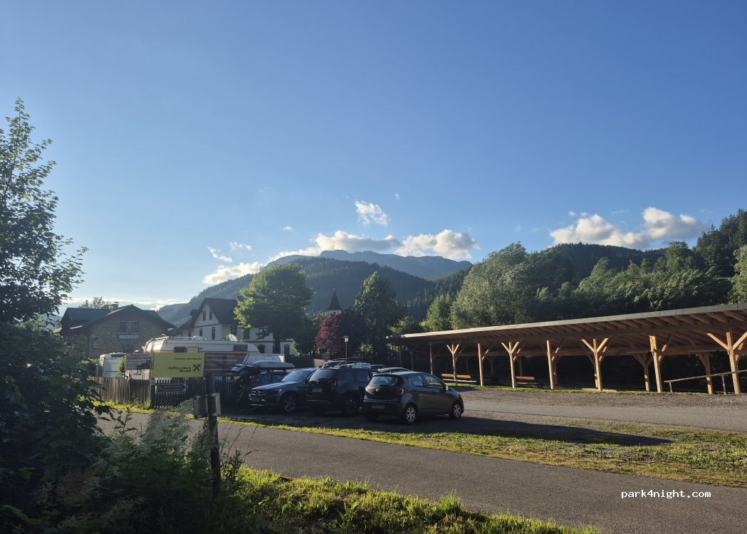 Cozy RV parking lot next to the Mürz river. 12€/night, the price includes service and electricity. Bicycle paths and hiking opportunities in the area. There is a clean, free toilet in the fire department building in the village.