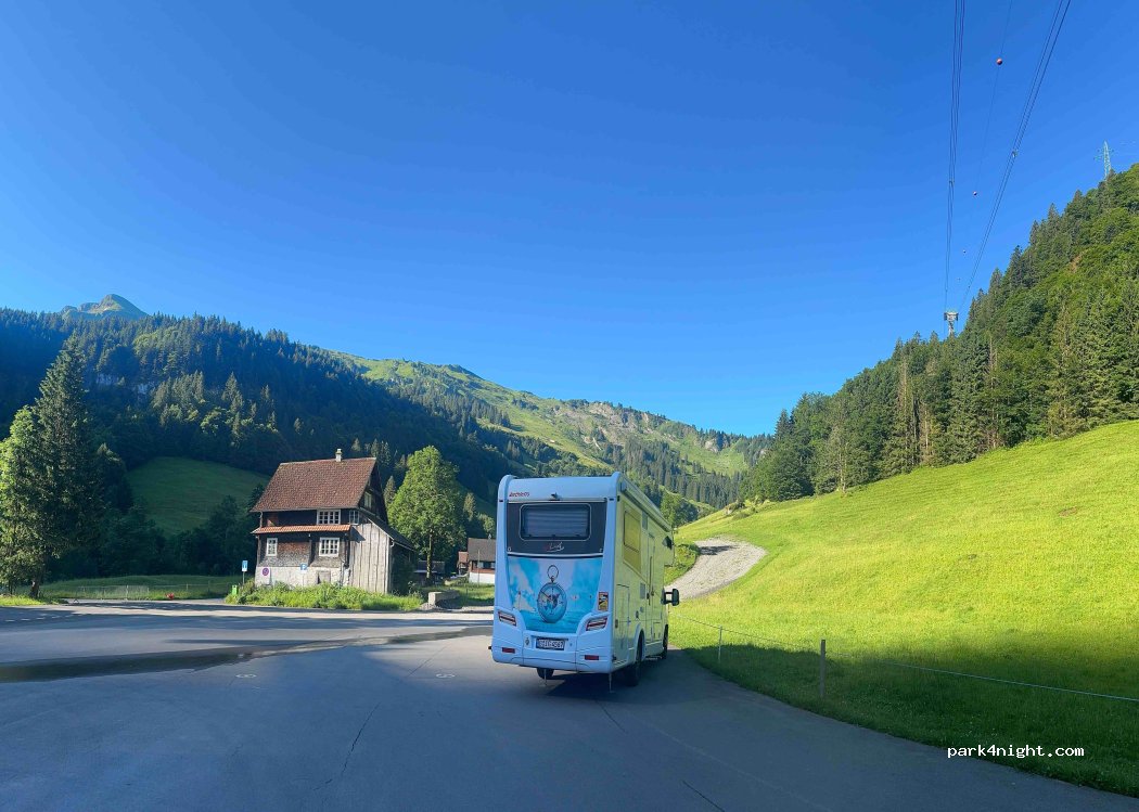 Das ist der Parkplatz für die Seilbahn. Ein WC hat es in der Talstation. Übernachten wird geduldet.