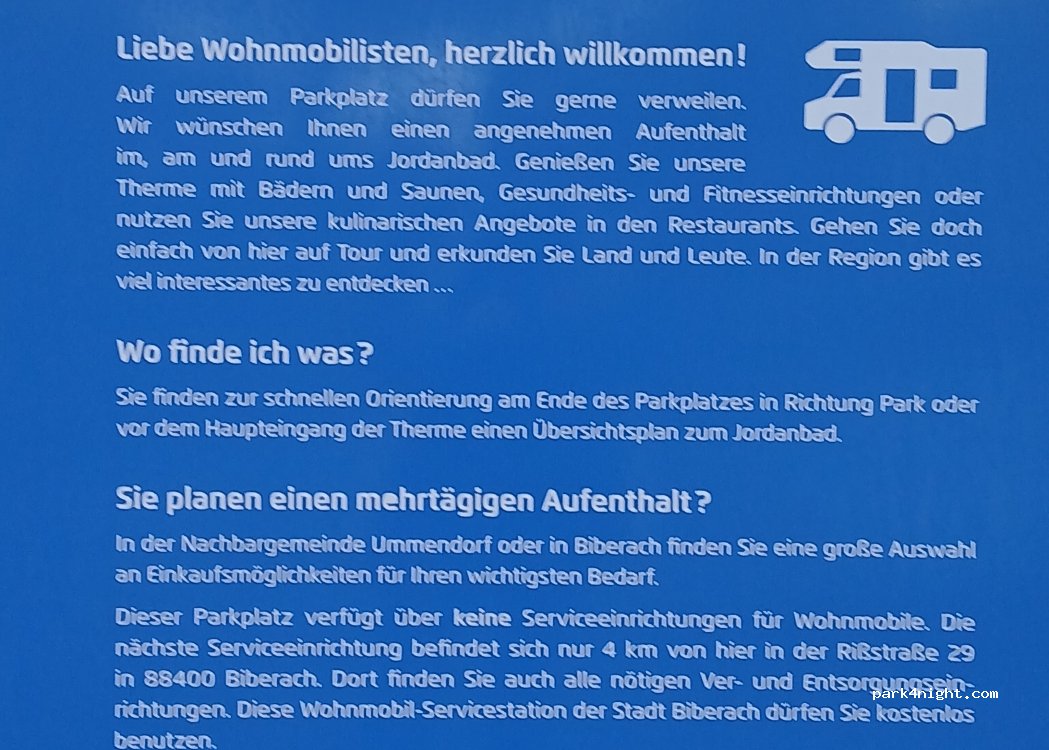 Parkplatz am Thermalbad mit Sauna. Keine Versorgung. Zwei Restaurants in direkter Nähe (Parkhotel und Feuerstein) oder in Ummendorf (1km). Dort auch Einkaufsmöglichkeiten. Radweg und Busverbindung nach Biberach (5km).