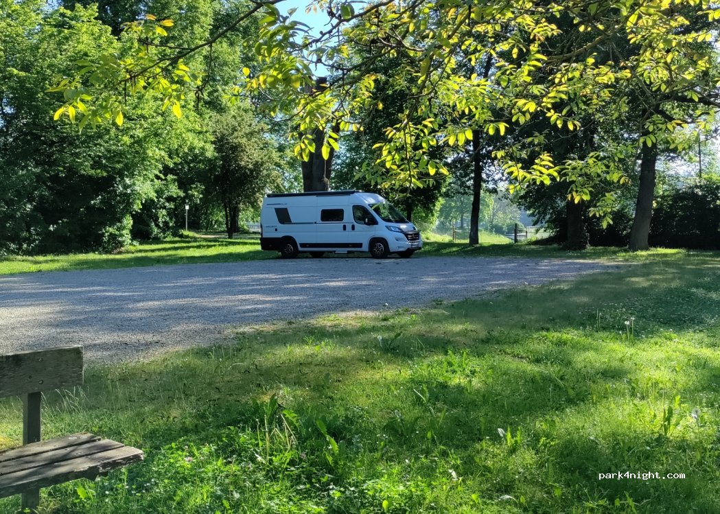 Parkplatz am Ortsrand, wunderschön gelegen in der Nähe einer Kirche. Sportplatz nebenan - wenn dort kein Betrieb, sehr sehr ruhig!